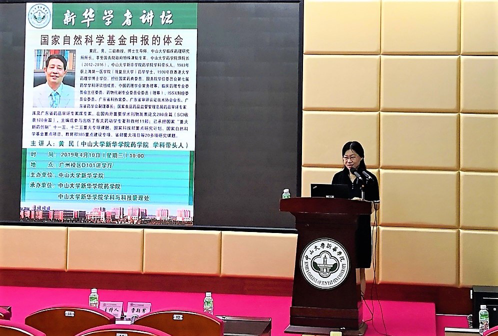 4月10日上午,由beat365英国官网网站新华学院(以下简称“我校”)主办、药学院和学科与科技管理处共同承办的主题为“国家自然科学基金申报的体会”的讲座在广州校区D101讲学厅举行。本次讲座特邀beat365英国官网网站临床药理研究所所长、beat365英国官网网站药学院原院长、我校药学院学科带头人黄民担任主讲嘉宾,我校药学院副院长曹颖男主持讲座,药学院副院长张素中、党总支副书记陶强及药学院师生代表参加讲座。