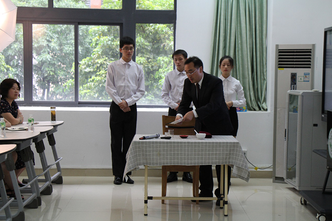 利尚仁副教授表示,作为最能彰显中华礼仪的餐桌礼仪,原先仅有王公贵族需学习餐桌礼仪,自改革开放以来,餐桌礼仪开始走入千家万户。利尚仁副教授通过视频展示向师生分享道,在餐桌礼仪方面,国内与国际依旧存在许多不同之处。如在餐桌的座次安排上,国内是主人应当面对正门口,主宾面对主人座,背对门口。而国际礼仪则恰恰相反,主人需背对门口入座,主宾座次则正对门口。另外,在餐具摆放上,中西餐也有着不同之处,现场利尚仁副教授也为同学们做了详细示范。
