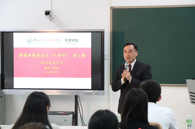 而“大学吧”第三期将我们大学立德树人的教育初心,用心地聚焦到大学生生活礼仪的培养,来将王庭槐校长倡导的大学学习生活、未来人生幸福需要美育的理念推广开来。7月2日,我校管理学院党总支开展了“大学吧”第三期主题学习活动,聚焦生活礼仪的培养问题,特邀管理学院副教授利尚仁博士作主题分享。