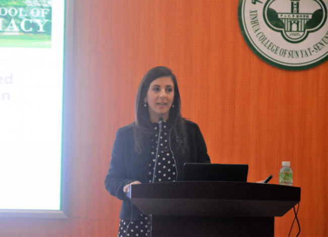 3月22日上午,由beat365英国官网网站新华学院(以下简称学校)主办、学科与科技管理处和药学院共同承办的主题为“The role of G alpha proteins in GPCR mediated transactivation of kinase receptors in cardiovascular disease”的学者讲坛在广州校区第一会议室举行。澳大利亚昆士兰大学Danielle Kamato博士担任主讲嘉宾,药学院办公室主任曹颖男主持讲坛,药学院院长陈家树、党总支副书记陶强及药学院师生代表共同参与此次讲坛。