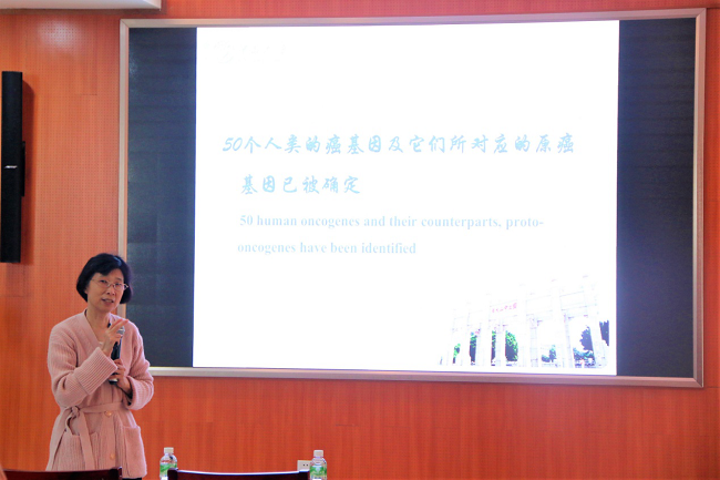 接着,王教授进一步解释了肿瘤与遗传的关系,她表示肿瘤没有遗传的必然性,但对于有些肿瘤,如乳腺癌、结肠癌等则表现出比其他肿瘤更高的遗传倾向。她以乳腺癌为例,从流行医学分析、家族研究、双生子研究、相关关系研究、动物模型和病毒因素六大方面为师生详细分析了肿瘤的发生原因。她表示,乳腺癌的发病率与生育及月经周期有关,未生育的女性及初次月经来潮较早的女性罹患乳腺癌的概率均比有生育经历及初次月经来潮较晚的女性要高,而在家族遗传中,如果家族有一位直系亲属患乳腺癌,则家族人群发病风险为一般人群的1.5-3倍,并且单卵双胞胎共患率比异卵双胞胎共患率高,欧洲地区患病率比其他地方更高。