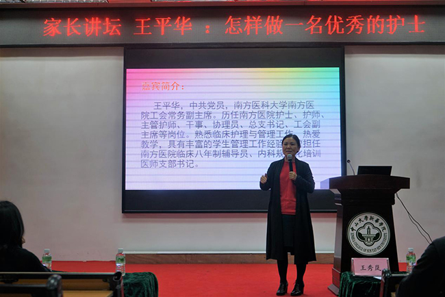 1月19日,由护理学院承办的主题为“怎样做一名优秀的护士”的家长讲坛在广州校区教学楼举行。本次讲坛邀请南方医科大学南方医院工会常务副主席王平华女士担任主讲人,护理学院执行院长王秀岚教授主持讲座,护理学院师生代表参加了本次讲座。