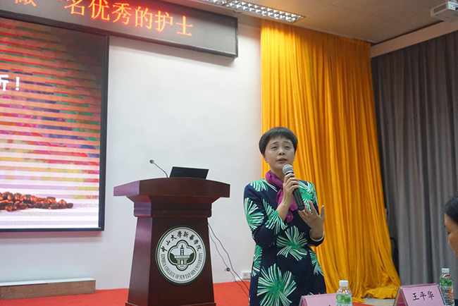 王秀岚为讲座致辞。她将护理学院六字人才培养目标“能用、好用、耐用”与演讲主题“怎样做一名优秀的护士”联系起来讲道:“我校护理学院培养出来的护士不仅是合格能用的,还是好用耐用的,达到优秀的水平,让护理学院的学子将来成为人才,这才是我们培养护士的宗旨。让大家在学习的过程中,逐步成为一名优秀的护士。”