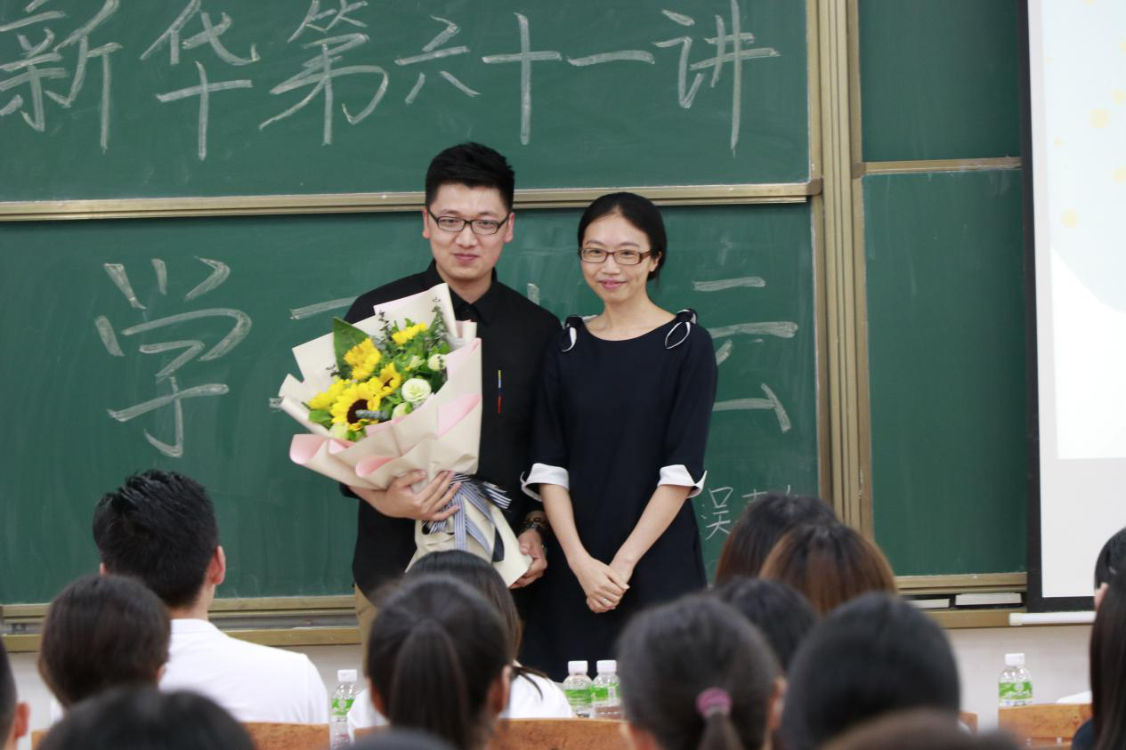 讲座尾声,党总支副书记廖诗颖给主讲人吴嘉华赠予鲜花,感谢他开阔了中大新华学子的视野,激励他们树立远大志向和拼搏进取的信心。