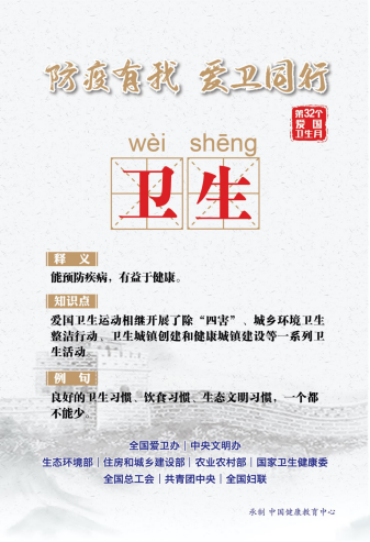2020年3月2日,习近平总书记在北京考察新冠肺炎防控科研攻关工作时强调:“要坚持开展爱国卫生运动,从人居环境改善、饮食习惯、社会心理健康、公共卫生设施等多个方面开展工作,特别是要坚决杜绝食用野生动物的陋习,提倡文明健康、绿色环保的生活方式。”察实情,出实招,看实效,在这场万众一心的全民战“疫”中,你我的关心始终是总书记的关切。为深入贯彻习近平总书记重要指示精神,全面落实坚决打赢疫情防控人民战争、总体战、阻击战的要求,全国爱卫办、中央文明办、生态环境部、住房和城乡建设部、农业农村部国家卫生健康委、全国总工会、共青团中央和全国妇联联合下发通知和倡议,要求各地开展第32个爱国卫生月活动,为全面打赢新冠肺炎疫情阻击战营造良好环境,充分发挥密切联系群众的独特优势,广泛动员人民群众参与爱国卫生运动。