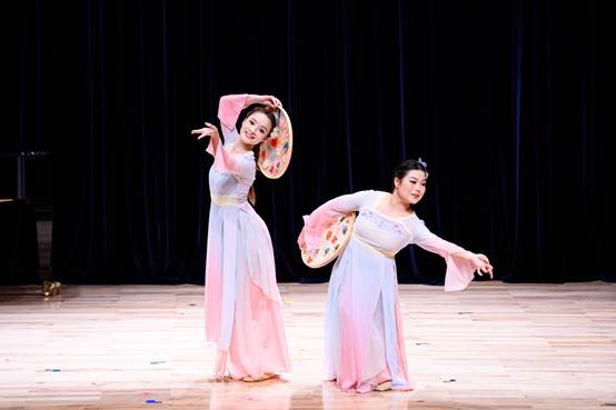 《City of Stars》萨克斯与钢琴四手联弹,用灵动的音符营造出浪漫氛围;《追寻》男女二重唱,史扬子与宋浩然老师配合默契,歌声动人;双人舞《茶花开了》以翩跹舞姿诠释岭南柔美,赢得阵阵喝彩;钢琴四手联弹《玉盘》,琴音清脆悦耳,勾勒出“大珠小珠落玉盘”的诗意画面。琵琶与钢琴协奏的《平湖秋月》,琵琶的清脆灵动与钢琴的优雅醇厚完美融合,晕染出江南水墨般的意境,仿佛将听众带入了一幅诗意的画卷。