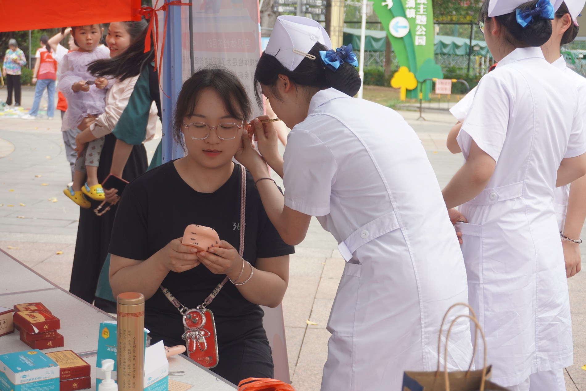 活动设置了多个特色专区,志愿者们为市民提供了丰富的服务和指导。在中医护理专区,志愿者运用推拿按摩、艾灸理疗、耳穴压豆等传统疗法为市民缓解肌肉疲劳、祛湿调体,并同步讲解中医养生原理。在营养膳食区,志愿者通过图表分析BMI指数,指导市民定制科学食谱;在婴幼儿照护区,他们还手把手演示婴儿抚触与智能训练技巧,帮助新手父母掌握育儿技能,多角度提升健康管理意识。