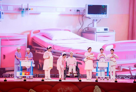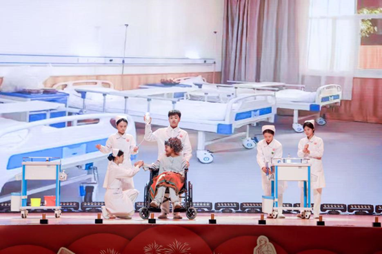 聚光灯下的每一幕,都是护理日常的鲜活缩影:常规病房组推着轮椅俯身倾听,“三查八对”的动作里,是刻进骨子里的严谨与温柔;儿科护士手偶轻摇,甜笑里裹着对患儿的柔软守护;妇产科护士怀抱“新生”的姿态,把生命起点的希望揉得滚烫;急诊科推着抢救车奔来,跪地心肺复苏的干脆利落,是与时间赛跑的果敢;手术室传递器械的默契配合,让“无影灯下的第三只手”有了具象的温暖。6组科室的演绎,把“专业”拆成了看得见的动作,把“温柔”变成了摸得到的温度。