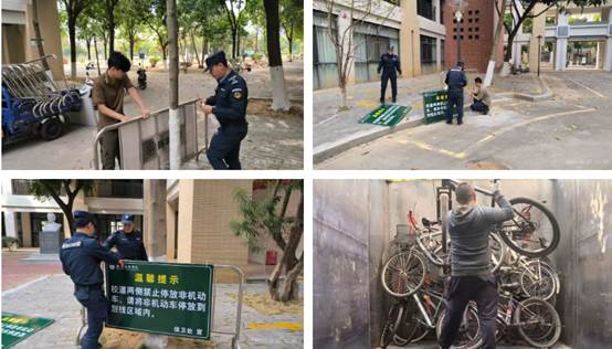针对假期可能出现的环境问题,保卫处开展了校园秩序集中整治行动。一是通过提前发布公告,集中清理长期无人认领的废弃非机动车,腾挪停车资源;二是联合校卫队对生活区、教学区倒地及乱停放车辆进行规范摆放,硬化可利用区域并划清晰停车标识线,设置铁马隔离设施和停车指引牌,引导师生有序停车,确保开学后校园交通顺畅、秩序井然。