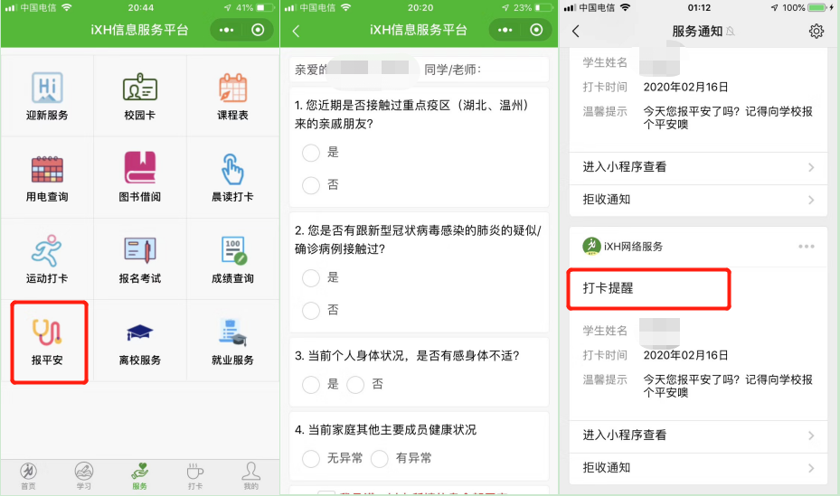 为积极响应教育部印发的《关于在疫情防控期间做好普通高等学校在线教学组织与管理工作的指导意见》文件精神、《广东省教育厅关于全力防控疫情确保开学安全的通知》各项要求及学校《关于贯彻落实<广东省教育厅关于做好学校新型冠状病毒感染的肺炎疫情防控工作的紧急通知>做好我校防控工作的通知》等文件精神,beat365英国官网网站新华学院信息与网络管理处(下文简称“信息处”)通过自研发平台“iXH信息服务平台小程序”开设“报平安”功能,并增加每日“打卡提醒”,协助学校人事处、学生处做好师生健康信息和人员地理位置分布情况采集,实现了学校采取信息化、大数据手段,全覆盖、全天候动态跟踪师生生命安全和身体健康情况,既避免了“填表抗疫”的疲惫,又准确掌握了师生出行、居家分布数据和身体健康状况。