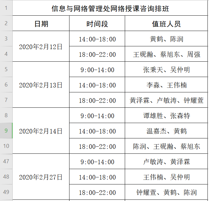 信息与网络管理处网络授课咨询排班部分截图