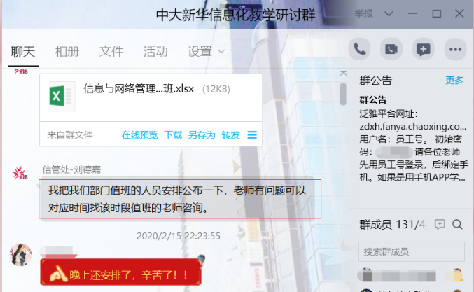 中大新华教学科研群及时公布网络授课咨询排班表