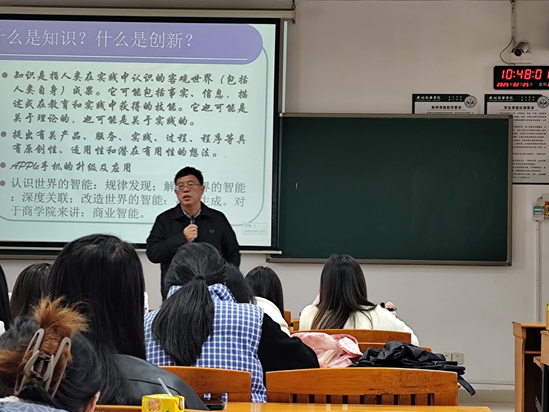 在课堂上,彭建平表示,青年学生应该深入了解党的路线、方针、政策,准确把握国情、党情、社情与民情,努力增强“四个意识”、坚定“四个自信”、做到“两个维护”,不断提高自身能力和政治素养,履行新时代青年的使命,为实现中华民族伟大复兴的中国梦而不懈奋斗。他还表示,当今技术创新正引领着教育内容的深刻变革。青年学生应当主动关注前沿学术内容,了解技术进步如何推动商业模式的变化;不断提升自身的综合素质,尤其是提升数据处理能力,为未来的挑战做好准备;努力学习、积极思考,在自己专注的领域内不断深耕,成长为具有创新精神的新时代人才。