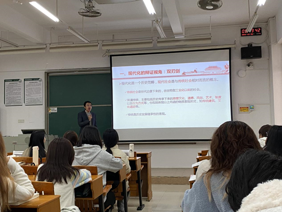 武亮从辩证唯物主义角度系统阐述了现代化的本质特征,旨在引导学生深入理解中国式现代化的深刻内涵,把握传统与现代的辩证关系。他认为,面对现代化进程中的新生事物,既要深刻认识其历史必然性和时代重要性,又要以科学理性的态度进行全面审视,通过实践的检验不断完善认知。他表示,推进中国式现代化必须正确处理传统与现代的关系,要深入挖掘中华优秀传统文化在凝聚民族精神、维系情感纽带、促进人格养成、推动生态文明建设等方面的重要价值,为中国式现代化注入深厚的文化底蕴。