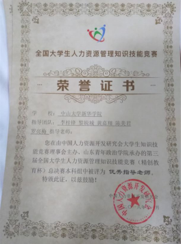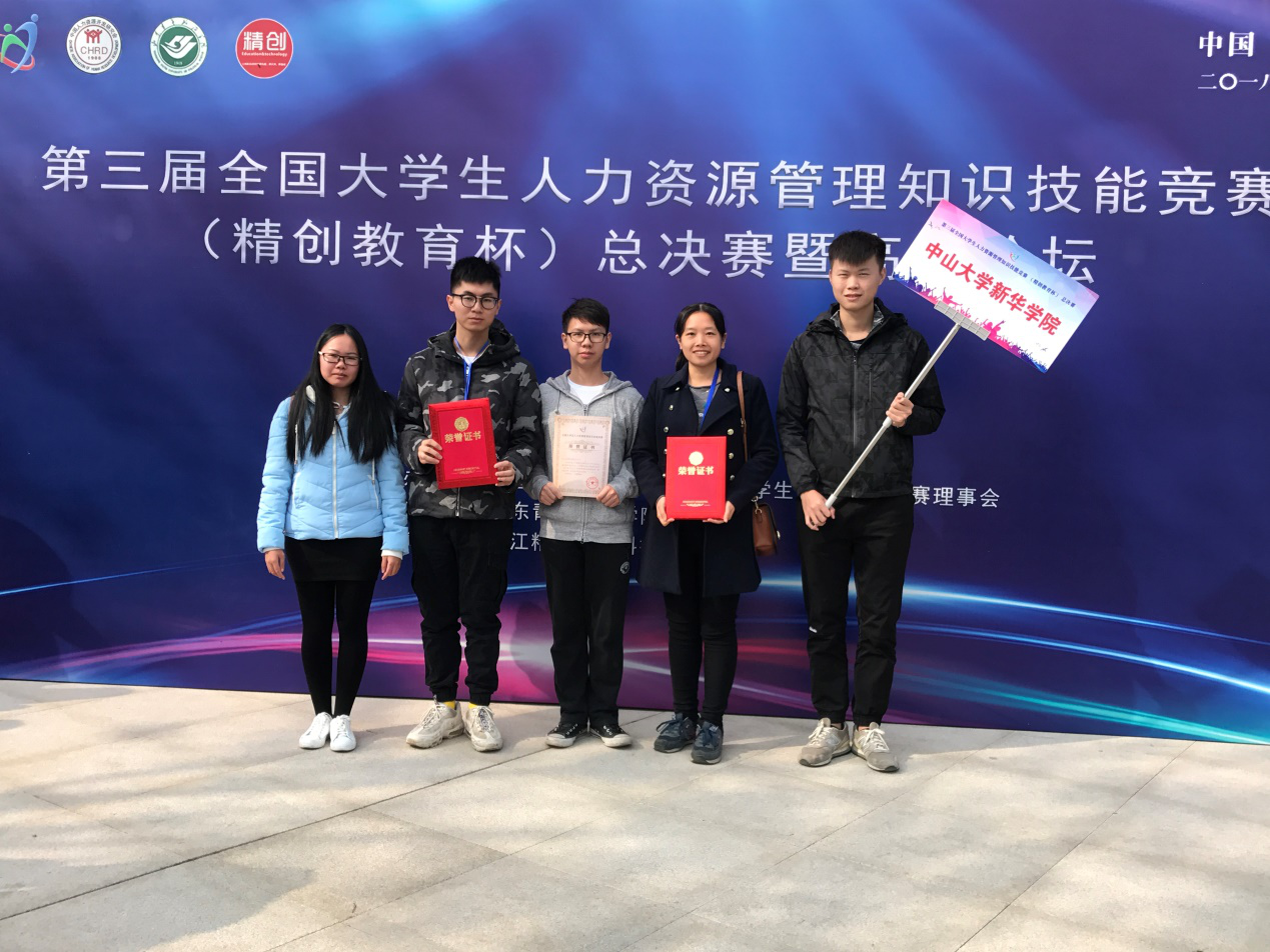 11月3日-4日,由中国人力资源开发研究会主办的第三届全国大学生人力资源知识技能竞赛(精创教育杯)全国总决赛暨高峰论坛在山东济南举行。我校公共治理学院代表队从全国365支参赛队伍1500余名学生中晋级总决赛。本次全国总决赛共有7个本科组大区赛、2个高职组大区赛共81支队伍参加,参赛师生总数达600余人。经过激烈角逐,由我校公共治理学院16级人力资源管理专业学子李梓锋、黎锐城、黄嘉翔、陈美君组成的团队荣获本科组二等奖,公共治理学院区展玲、罗亮梅老师荣获优秀指导老师奖。我校荣获优秀组织奖。