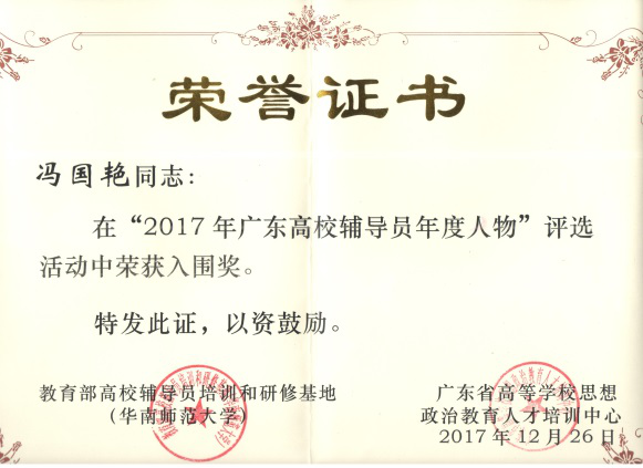 1月20日,教育部高校辅导员培训和研修基地(华南师范大学)下发了《关于公布“2017年广东高校辅导员年度人物”评选活动结果的通知》》(粤辅导员基地函﹝2017﹞18号),我校艺术与传媒学院罗万玲、管理学院冯国艳两位辅导员老师荣获“2017年广东高校辅导员年度人物”入围奖。