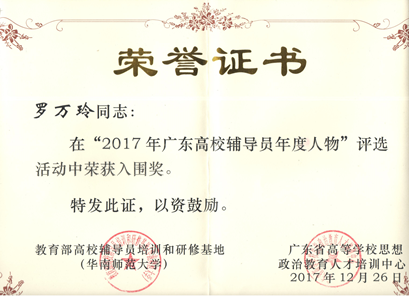 三年多来,罗万玲老师在辅导员岗位上,秉承育人为本、德育为先的教育理念,导心导行,亦师亦友,执着探索辅导员专业化成长之路。她努力拓展工作途径,依托新媒体平台多渠道地开展思想政治教育,积极推行公益实践育人,带领学生坚持进行义教,使得爱与艺术流通于身边。她注重解决学生的实际问题,有针对性地帮助学生处理好学习成才、择业交友、心理健康、宿舍管理、帮困助学等方面的具体问题。她将实践工作与理论学习相结合,坚持学习相关理论知识,积极参加各级各类业务培训,承担《创业与就业教育》课程教学,发表论文《科学发展观视野下独立学院艺术社团建设的思考》,参编教材《大学生生涯规划与就业指导》、《大学新生心理健康自助手册》,参与省级校级课题多项,荣获省级及以上奖项5项,其中,在2017年获得第六届广东省高校辅导员职业能力大赛三等奖。她在很多方面取得了较好成绩,收到了学生和同事们的好评。
