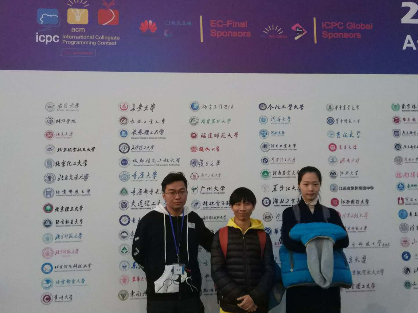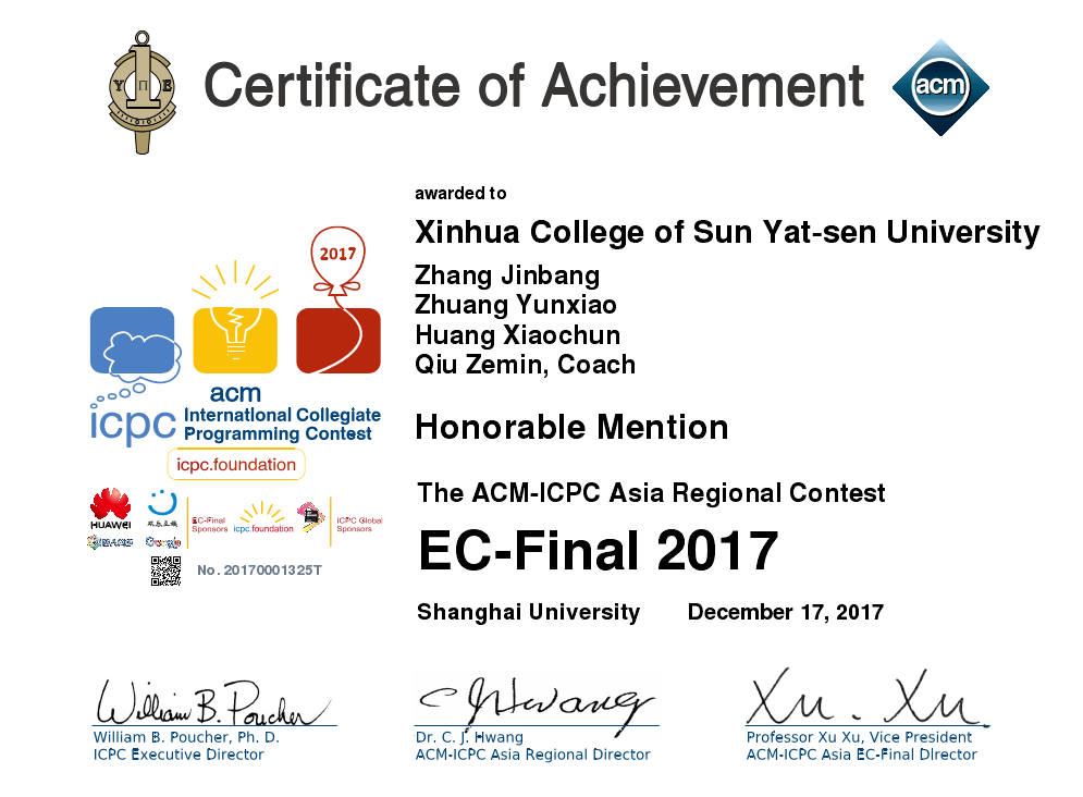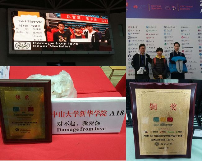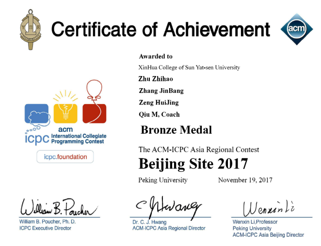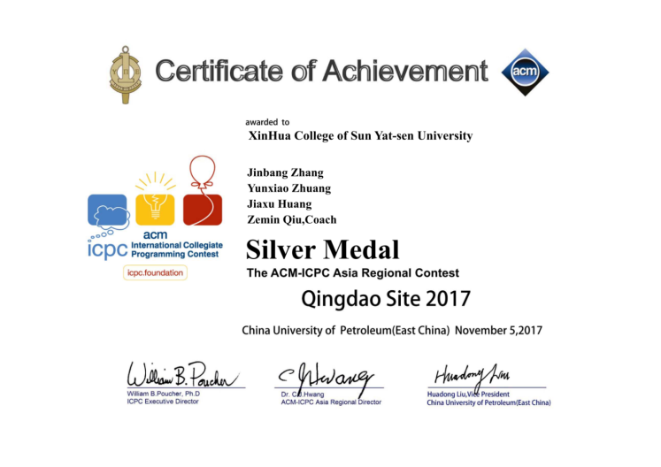 ACM国际大学生程序设计竞赛(英文全称:ACM International Collegiate Programming Contest(简称ACM-ICPC或ICPC))是全球大学生计算机程序能力竞赛活动中最有影响的一项赛事,是全球历史最悠久、规模最大且最负盛名的程序设计竞赛。第42届ACM国际大学生程序设计竞赛由各大洲区域预赛和全球总决赛两个阶段组成,区域预赛在2017年的10-12月举行,全球总决赛在2018年5月举行。我校信科院张锦邦、庄云晓、黄佳旭、朱志豪、曾惠靖、黄晓纯6名同学组成竞赛团队参赛。其中,张锦邦、庄云晓、黄佳旭在11月5日获得了青岛赛区银奖,张锦邦、朱志豪、曾惠婧在11月19日获得了北京赛区铜奖,张锦邦、庄云晓、黄晓纯在12月17日获得了EC-Final优胜奖。