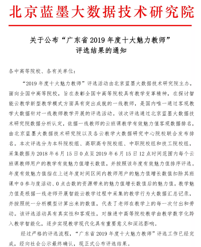 据悉,广东省“2019年度十大魅力教师”评选活动由北京蓝墨大数据技术研究院主办是经北京蓝墨大数据技术研究院数据分析认定,依据一线教师的云班课教学魅力值客观数据排名,最终由北京蓝墨大数据技术研究院以及各省云教学大数据研究中心联合发布排名。该评选活动旨在表彰中国中、高等院校中具有教学变革精神、在探讨智能云教学新型教学模式方面具有突出成就的一线教师,是国内唯一通过客观教学大数据针对一线教师教学开展的评选活动。