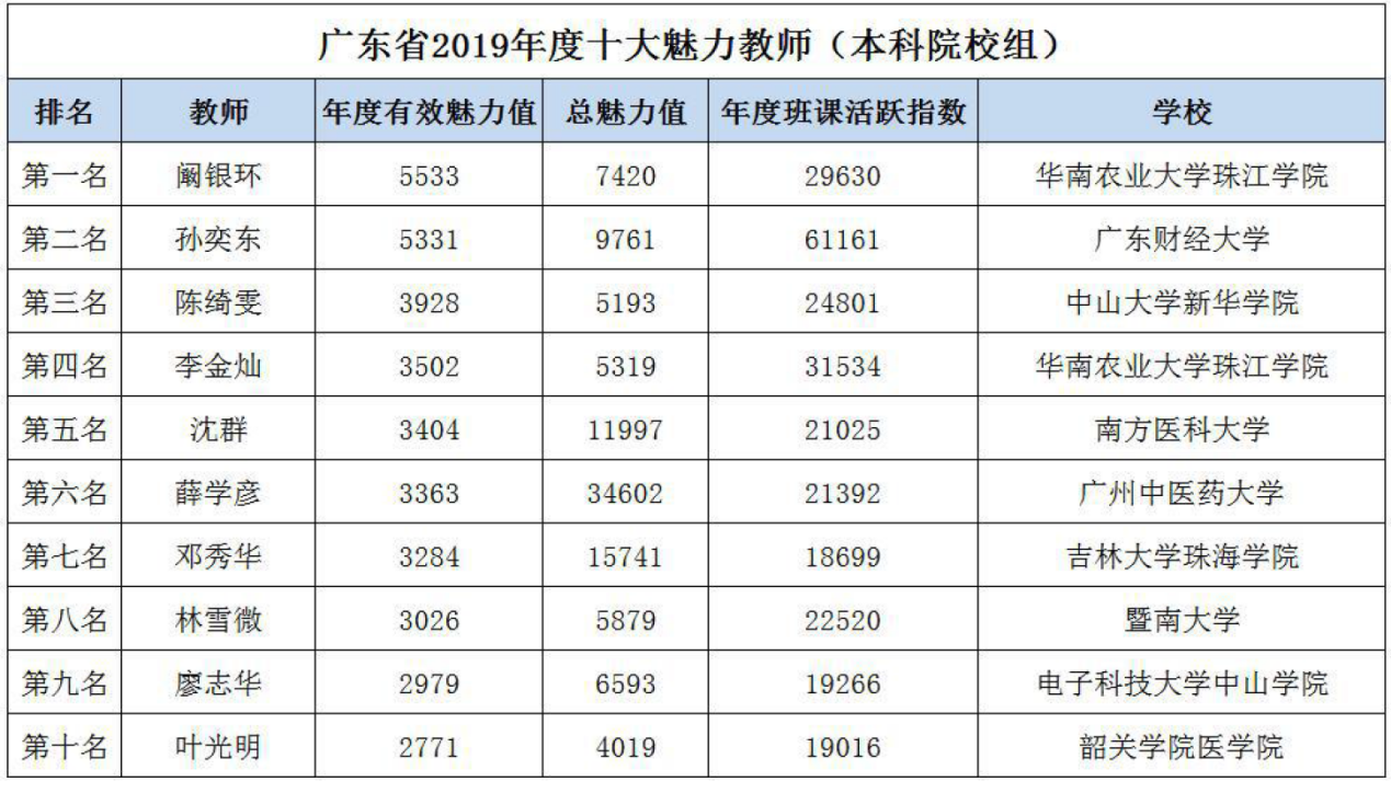 “广东省2019年度十大魅力教师(本科院校组)”排名