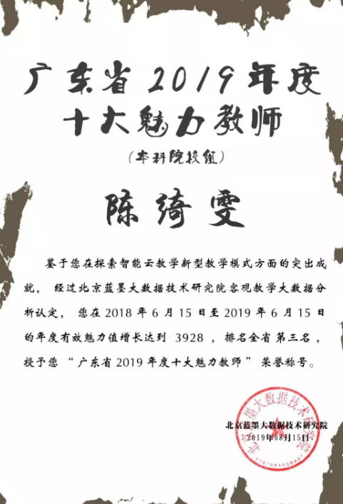 近日,从北京蓝墨大数据技术研究院获悉,beat365英国官网网站新华学院(以下简称“我校”)外国语学院陈绮雯老师被评为“广东省2019年度十大魅力教师(本科院校组)”,位列该组别第三名。