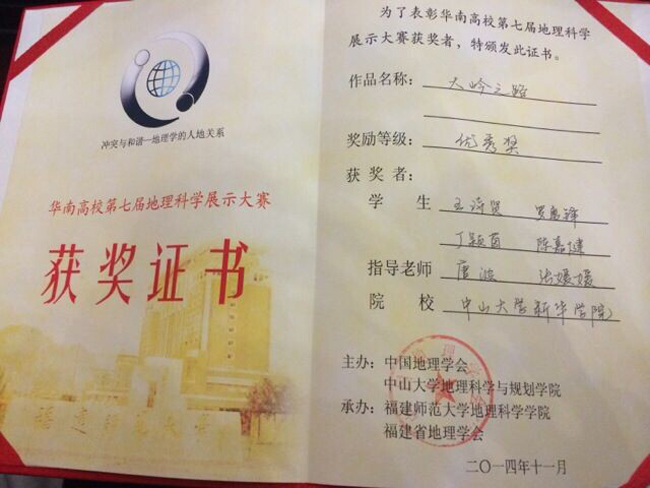 华南高校地理科学展示大赛作为华南地区乃至全国具有相当大的影响力的地理学术活动,本次主题 “冲突与和谐——地理学的人地关系”也极富学术性,现场气氛激烈,赛程分为两个环节进行,分别是展示成果和现场答辩。我院代表队围绕大赛主题对研究课题《大岭之路》进行了精彩的展示,在答辩环节我院参赛者机智的现场答辩更是赢得了在场近600名地理学子的阵阵掌声。力压香港中文大学、广东财经大学等高校,荣获优秀奖组内第一名的佳绩。