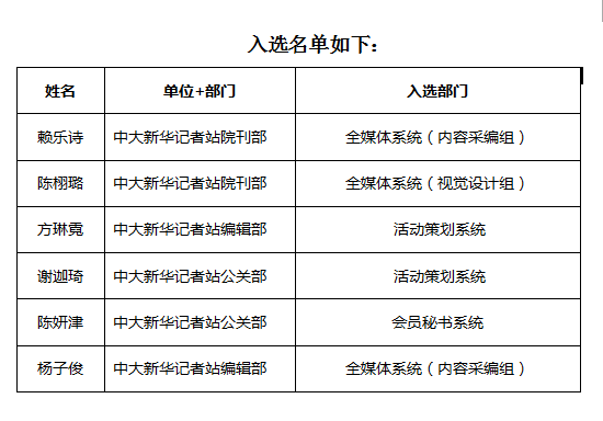 日前,中国(广东)高校传媒联盟(以下简称联盟)公布第八届部委面试结果,中大新华记者站赖乐诗等6名学生记者再次成功入选联盟部委。