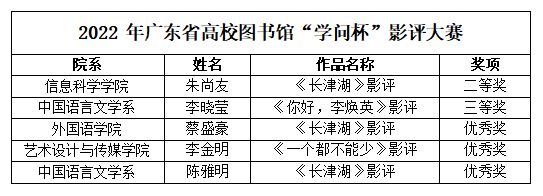 2022年6月,以“传承红色基因,争做时代新人”为主题的2022年广东省高校图书馆“学问杯”影评大赛评审结果出炉。我校学子获二等奖1项、三等奖1项、优秀奖3项,图书馆获优秀组织奖,图书馆唐玉佳老师获优秀组织个人奖。