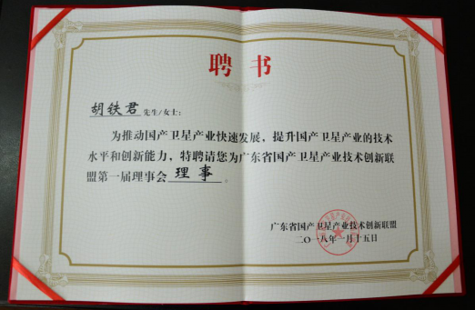 胡铁君教授当选广东省国产卫星产业技术创新联盟第一届理事会理事聘书