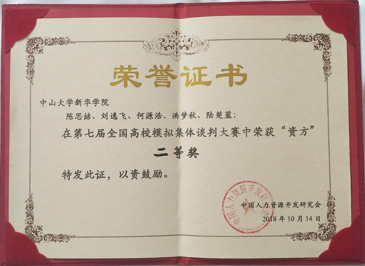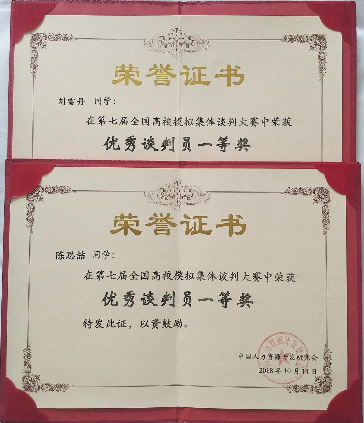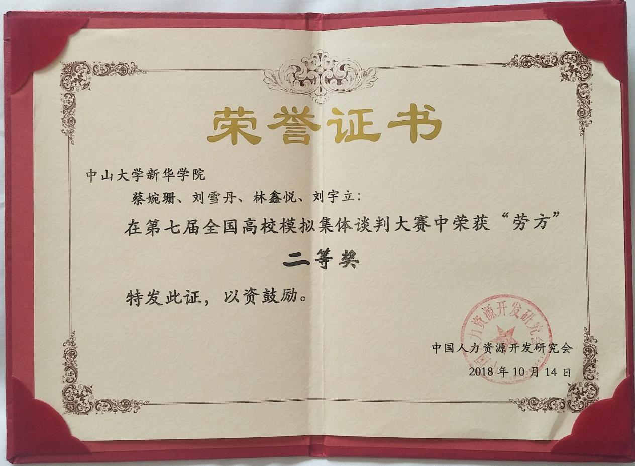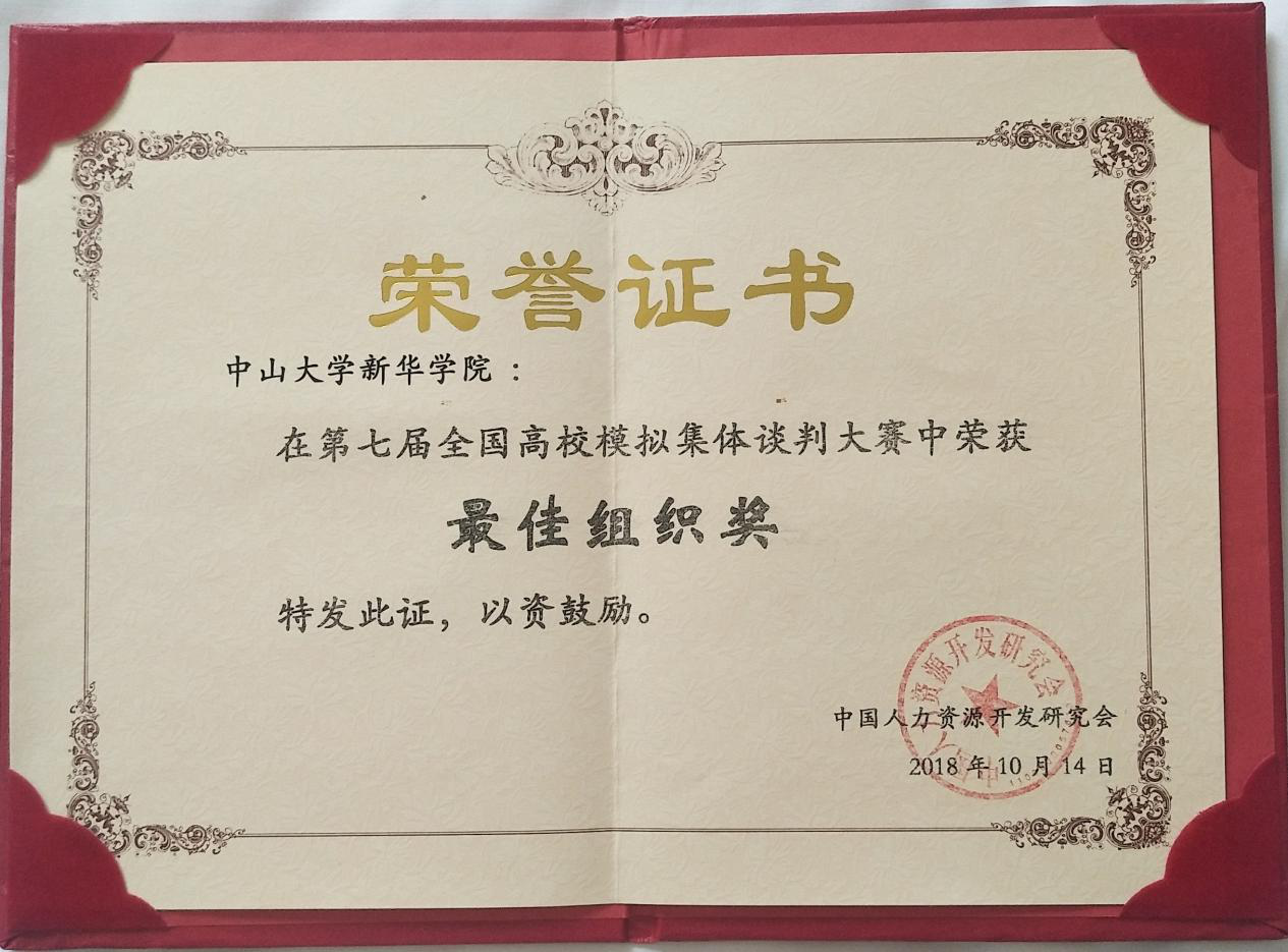 10月13日至14日,由中国人力资源开发研究会劳动关系分会和山东管理学院主办的第七届全国高校模拟集体谈判大赛在山东济南举行。来自14个省、市、自治区包括首都经济贸易大学、西南政法大学、华南农业大学等在内的34所高校组成的大规模比赛。经过激烈角逐,我校公共治理学院与法学院学子蔡婉珊、刘雪丹、林鑫悦、刘宇立共同组成的劳方代表队和陈思喆、刘逸飞、何源浩、洪梦秋、陆楚蓝组成的资方代表队均获全国二等奖;17级人力资源管理专业刘雪丹同学荣获劳方代表队“优秀谈判员一等奖”;17级人力资源管理专业陈思喆同学荣获资方代表队“优秀谈判员一等奖”;人力资源管理专业学科带头人徐刚教授与人力资源管理专业副主任罗亮梅老师获得“优秀指导教师一等奖”,我校获得“最佳组织奖”。