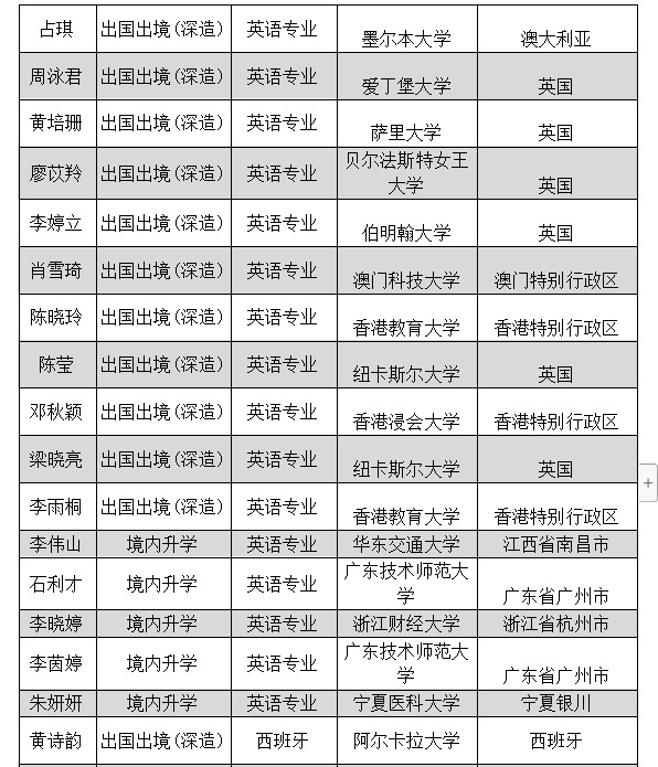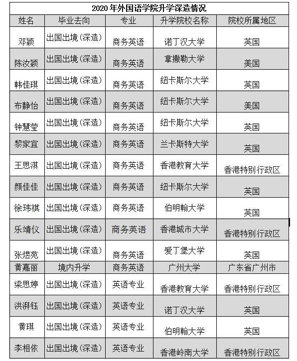 近日,beat365英国官网网站新华学院外国语学院(下文简称“外国语学院”)2020年被录取为硕士研究生的人数再创新高。2020届毕业生中共有36名同学被诺丁汉大学、拿撒勒大学、纽卡斯尔大学、香港教育大学、伯明翰大学、爱丁堡大学、广州大学、华东交通大学、广东技术师范大学等国内外知名学府录取,继续深造。