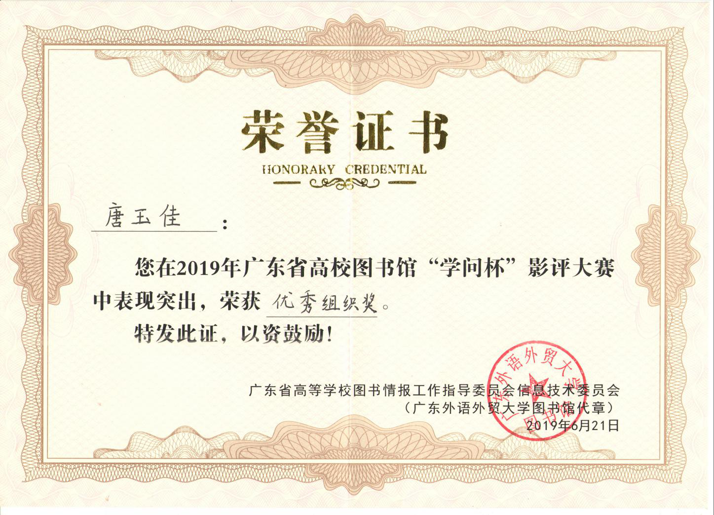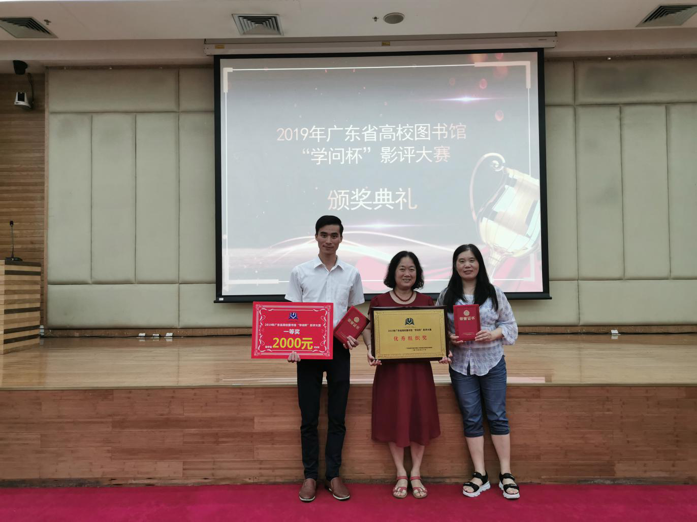 6月21日,由广东省高等学校图书情报工作指导委员会信息技术委员会和广东省高等学校图书情报工作指导委员会高职高专分委会举办的2019年广东省高校图书馆“学问杯”影评大赛颁奖典礼,在广东外语外贸大学图书馆举行,我校图书馆副馆长钟伟珍、唐玉佳老师,信息科学学院杨智云老师受邀参加典礼。