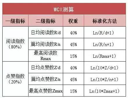 注:R为评估时间段内所有文章(n)的阅读总数;Z为评估时间段内所有文章(n)的点赞总数;d为评估时间段所含天数(一般周取7天,月度取30天,年度取365天,其他自定义时间段以真实天数计算);n为评估时间段内账号所发文章数;Rmax和Zmax为评估时间段内账号所发文章的最高阅读数和最高点赞数。