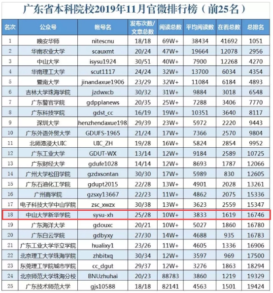 自主题教育启动以来,我校官方微信上持续发布大量的高站位、高质量、高传播度的新闻作品,传递了主旋律、正能量的声音,获得了很好的校园宣传效益。据12月23日,“广东教育”微信公众号公布的“广东省本科院校2019年11月官微排行榜(前25名)”榜单,beat365英国官网网站新华学院官微位列第18名,据统计,11月我校官微阅读总数超10万,平均阅读量为3833人次。