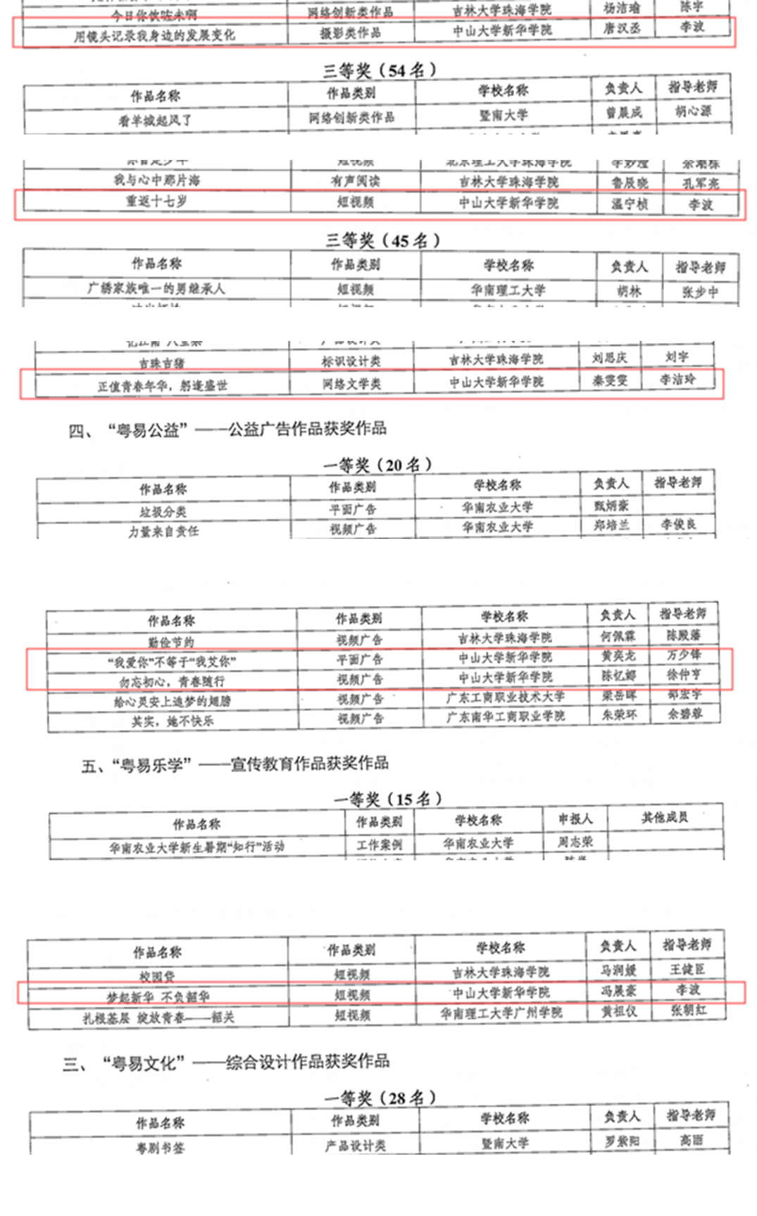 近日,广东省教育厅公布第四届广东高校优秀网络文化评选结果,我校广告类、短视频、摄影类、网络文学类等六项作品分别获奖。其中,由李波老师指导,温宁桢同学负责拍摄的短视频作品《重返十七岁》获二等奖、唐汉丞同学的摄影类作品《用镜头记录我身边的发展变化》获二等奖;由李波老师指导,冯展豪同学负责拍摄的短视频作品《梦起新华 不负韶华》获三等奖;由万少锋老师指导、黄奕龙同学负责拍摄的平面广告作品《“我爱你”不等于“我艾你”》获得三等奖;由徐仲亨老师指导、陈忆娜同学负责拍摄的视频广告作品《勿忘初心、青春随行》获得三等奖;由李洁玲老师指导、秦雯雯负责的网络文学类作品《正值青春年华,躬逢盛世》获三等奖。