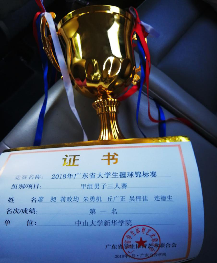 在过去的两年间,我校毽球队也是硕果累累,先后获得2017年广东省大学生毽球锦标赛团体三人赛亚军,2017年中国学生毽球锦标赛男子单人赛全国冠军、男女混合双人赛第四名、男子双人赛第六名、男子三人赛第六名的荣誉。