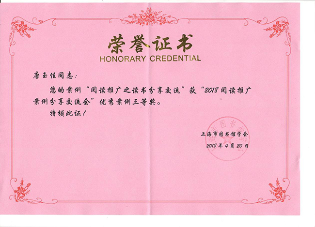 4月20日,由上海市图书馆学会阅读推广委员会、上海市图书馆学会新媒体阅读推广委员会主办的“2018阅读推广优秀案例征集”大赛颁奖大会在上海奉贤区图书馆举行。我校图书馆唐玉佳老师提交的案例“阅读推广之读书分享交流”荣获三等奖。