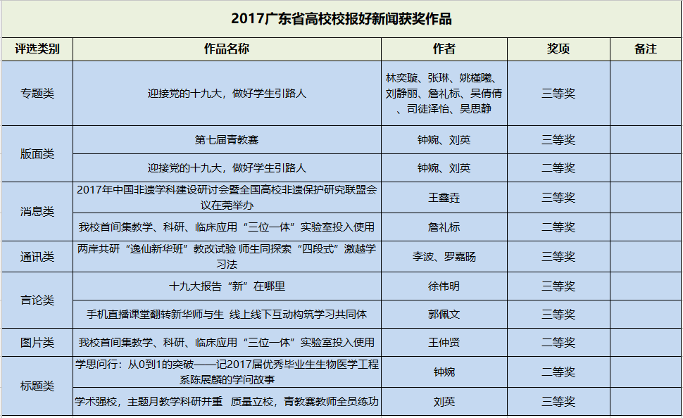 据悉,此次好新闻评选工作是在广东省教育工委的指导下,由广东省高校校报研究会常务理事会负责实施,由省内主流媒体资深新闻工作者以及省内外高校著名新闻专家学者进行评选。参评范围包括2017年发表在广东各高校校报上的消息、通讯、言论、版面、图片、标题、专题七类作品。评选活动吸引了beat365英国官网网站、华南理工大学、暨南大学、华南师范大学、华南农业大学、汕头大学、深圳职业技术学院等60多家省内高校参与,共有860多件作品参加评选。