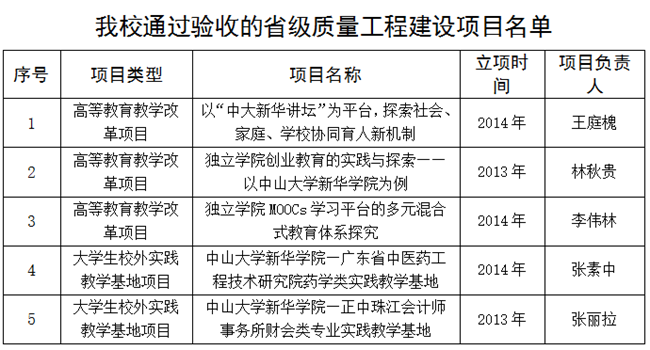 近日,广东省教育厅印发《广东省教育厅关于公布省“教学质量与教学改革工程”建设项目2016年度验收结果的通知》(粤教高函[2017]88号),我校2013、2014年立项的5个省级“教学质量与教学改革工程”(简称“质量工程”)建设项目通过验收,正式认定为省级质量工程项目。