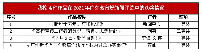 其中,我校新闻中心策划作品《新华十五年,有我见证》获一等奖,刘英的评论类作品《高校宣传工作者的意识、精神、思想标配》获二等奖,李波、刘英的新媒体作品《7月5日,新华解封!》、安娜的评论类作品《广州新华“三个聚焦”践行“我为群众办实事”》获三等奖。