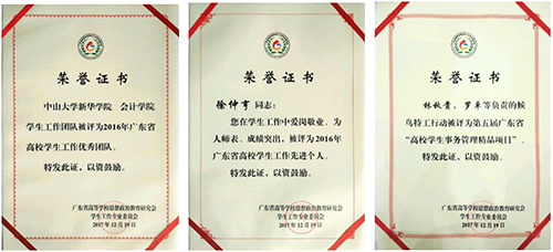 会计学院学生工作团队在日常工作中锐意进取,激流奋进,曾指导学生获得共青团中央学校部、人民日报社政文部、人民网联合举办的人民网全国大学生纪念抗战胜利70周年寻访活动优秀团队奖;在广东省教育厅主办的2016年“我的中国梦”——“立志·修身·博学·报国”主题教育系列活动中,荣获1个二等奖、1个三等奖和2个优秀奖;指导学生在第三届广东省大学生声乐比赛合唱类甲组比赛荣获三等奖。在学校工作方面,团队组织与老师也曾获学校“脉动青春”新生入学教育系列活动“优秀组织单位”和“优秀指导老师”等称号,并多次在校级辅导员职业技能大赛及学生工作开展方面摘取各项殊荣;在科研方面,团队老师承担学校多项课题,近两年发表论文20余篇。其中李杏余老师的论文《新媒体环境下民办高校德育建设的问题探究》获得了第四届全国民办高校党建工作论坛暨第十二届全国民办高校德育工作论坛“二等奖”。