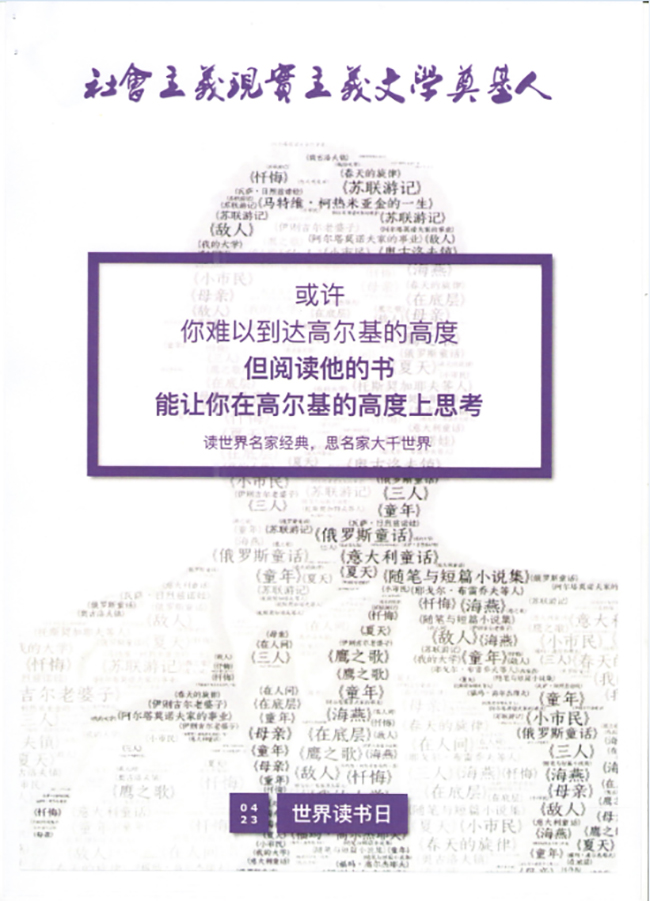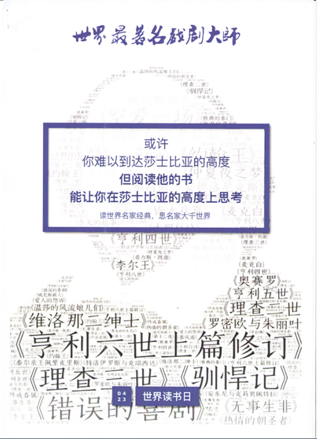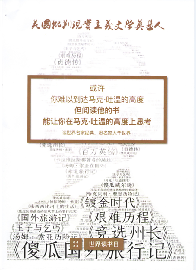 这组作品中,作者以阅读与收获之间的关系作为主题,将世界五个名家各自的作品名称拼成名家本人的轮廓图,以此作为背景,具有高辨识度;并将名家们在文学史中的地位置于海报上方,使观众一目了然,作品正中偏上位置设计了不同颜色的方框,与黑白的海报背景形成强烈的对比,引人注意;作品最下方的两个仿积木风格的小色块中的内置数字与文字简明有力地点明了海报主题——“4.23世界读书日”。