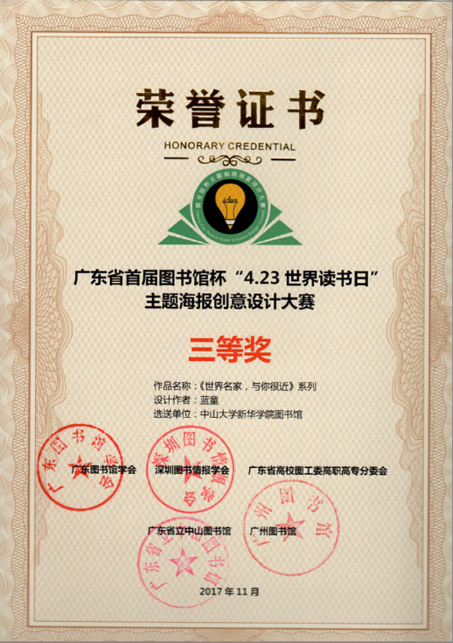 我校读者荣获广东省首届图书馆杯“4.23世界读书日”主题海报创意设计大赛三等奖