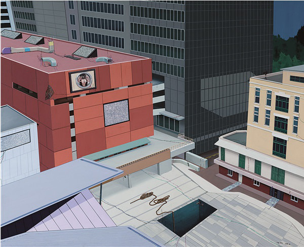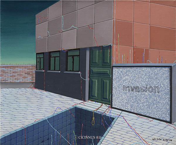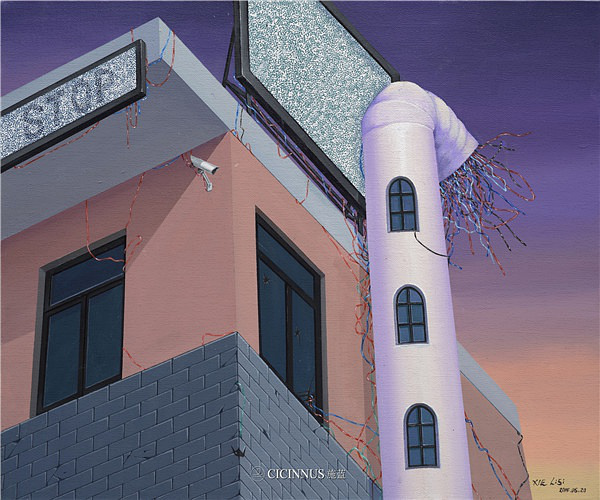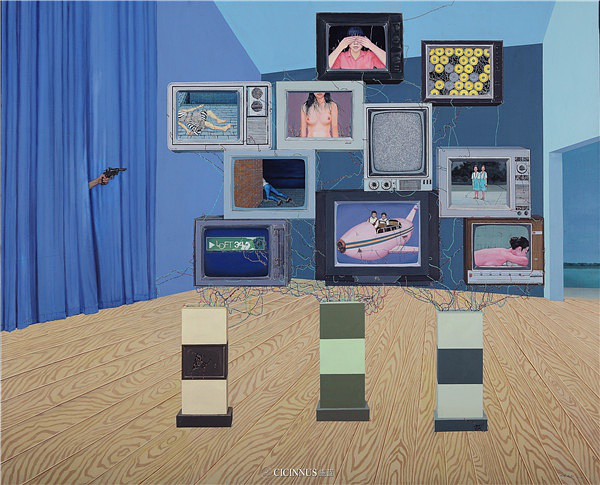 对于这一系列作品的创作灵感和寓意,谢莉斯老师谈到,今天我们生活在一个读图的时代,正如尼尔·波兹曼《娱乐至死》中:表达思想的方式将会影响所要表达思想的内容。一个社会用什么样的思想传播工具和方式,将会决定产生什么样的受众,同时产生什么样的社会文化,体现一个时代人的总体特征。屏幕——电视、视频、网络以及手机作为现代社会中我们认知世界的最主要“窗口”,实际上它们是意识形态和社会约定俗成的思想观念下的产物,它们会左右我们分析与判断乃至观察问题的方式与内容。试图把自我内在心理、情感、思考以及内在的机制用视觉的形象表现出来,从绘画对新型电子媒体的角度给予挖掘思考,用一种近乎布面装置的形式与观众面对面的交流。用传统的绘画对现代社会中的电视、电子摄像等图像进行并置展现,把电源和电器,甚至科学上的线路的元素、自然与空间中的人引接到一起。我们可以看到人生活在电的控制系统,在自动化的控制系统,甚至在我们看不见的另一个人造世界的控制系统之中,是看不见触摸不到的,但是,你能感受得到。画面用错乱空间视点的方式,为我们观看世界提供多视点,多元的观察方式:瞥视、偷窥、直视、反观……有一系列作品用多个荧幕图像的类似蒙太奇组接并置,且图像间又没有具体的表面逻辑关系,而每个图像背后却隐藏着一个共性关系,并置产生第三种意义,即向我们叙述着现实性中被习惯性的事物其背后的隐藏。