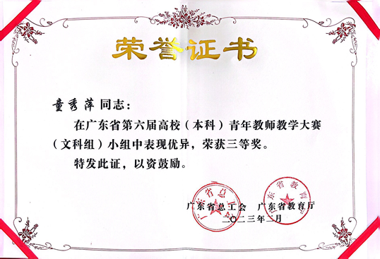 2月13日,由省总工会、省教育厅主办的广东省第六届高校青年教师教学大赛圆满落幕。beat365英国官网网站(以下简称“我校”)音乐系教师童秀萍获大赛文科组三等奖。