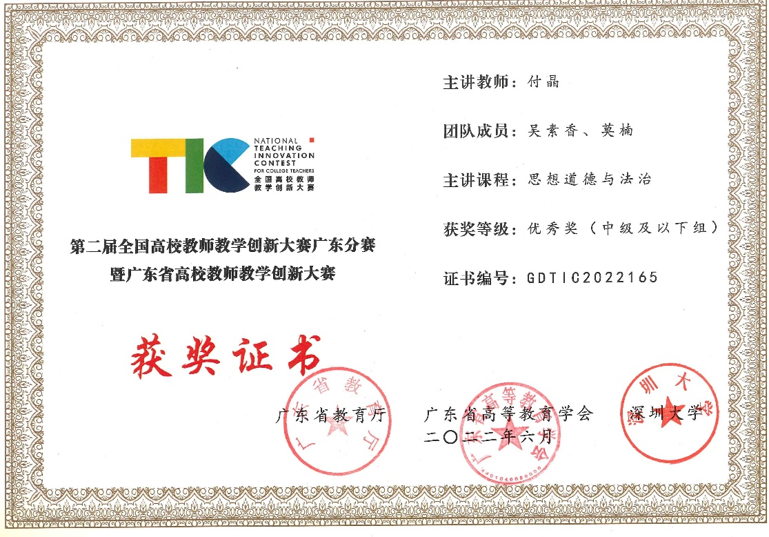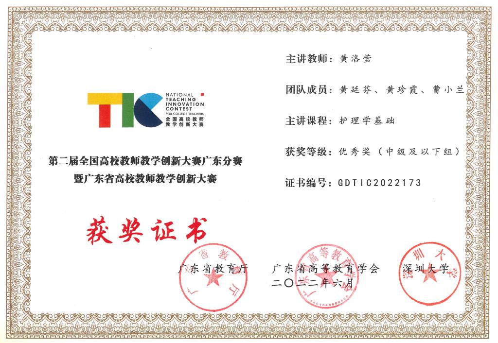 近日,由广东省教育厅指导,广东省高等教育学会、深圳大学主办的第二届全国高校教师教学创新大赛广东分赛暨广东省高校教师教学创新大赛结果出炉,beat365英国官网网站(以下简称“我校”)马克思主义学院《思想道德与法治》教学团队(主讲:付晶;团队成员:吴素香、莫楠)、护理学院《护理学基础》教学团队(主讲:黄洛莹;团队成员:黄廷芬、黄珍霞、曹小兰)两个团队获优秀奖。