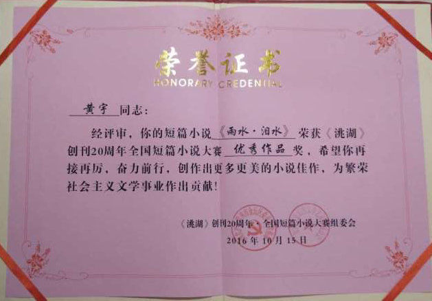 黄宇获《洮湖》创刊20周年全国短篇小说大赛优秀作品奖