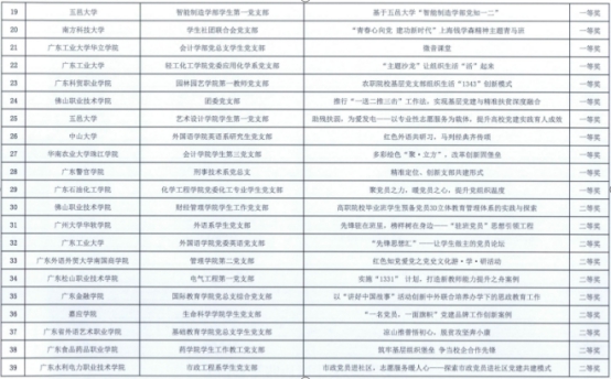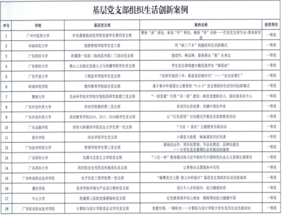 据悉,中共广东省委教育工委根据《中共广东省委教育工委关于开展全省教育系统基层党组织党建工作创新案例征集评选活动的通知》,经组织专家评审,共评选出“学校党委党建工作创新案例”47个,“基层党组织书记工作案例”63个,“基层党支部组织生活创新案例”129个。
