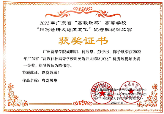 2022年广东省“高教社杯”高等学校“用英语讲大湾区文化”优秀短视频比赛决赛一等奖证书