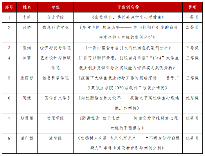 此次活动由高校思想政治工作队伍培训研修中心(华南师范大学)、广东省高等学校思想政治教育研究会联合举办,来自全省130所高校的1200份案例参与了评选。我校推选10项优秀案例参加评选,8项获奖,获奖率为80%,再创该项活动比赛获奖率新高。